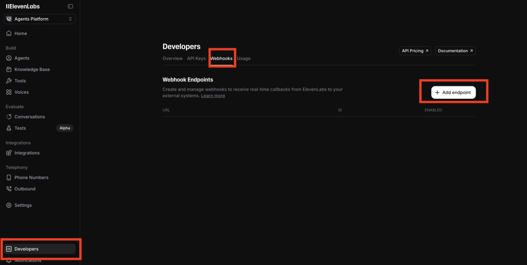 Login to eleven labs dashboard and navigate to Developers > Webhooks and add an endpoint for your URL.
